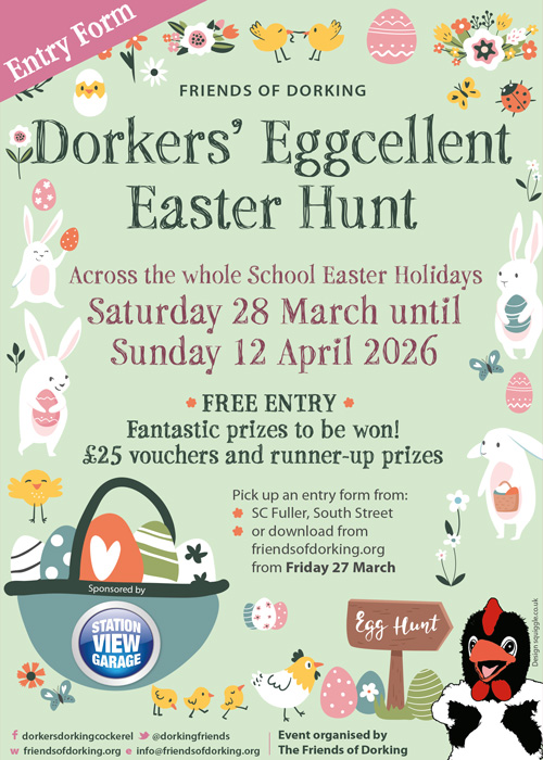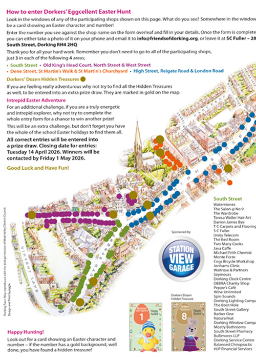 Each year we create the Dorkers' Eggcellent Easter Hunt and Spooktacular Halloween Hunt around Dorking for families. This has been very well received by both retailers, businesses and families. This is funded by the Friends of Dorking with help from sponsorship. If you are interested in helping us with sponsorship please contact us.